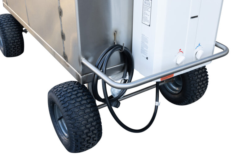 This 3-bowl self-contained sink is made to mount onto a trailer. We can add it onto many of our existing trailer models or include it in the design of new units. Designed for on-site clean-up. Holds 11 gallons of fresh water and 15 gallons of grey water.